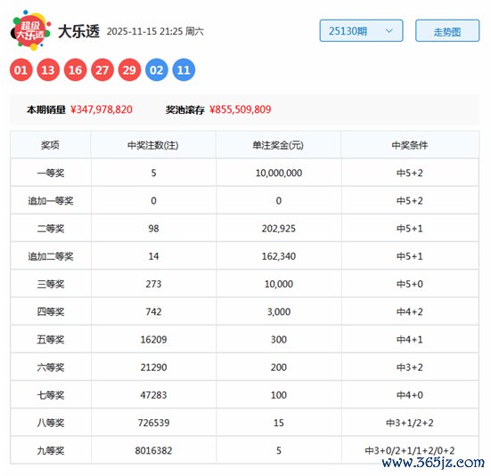 上期开奖:体彩大乐透第2025130期开奖号码为:01 13 16 27 29 + 02 11。